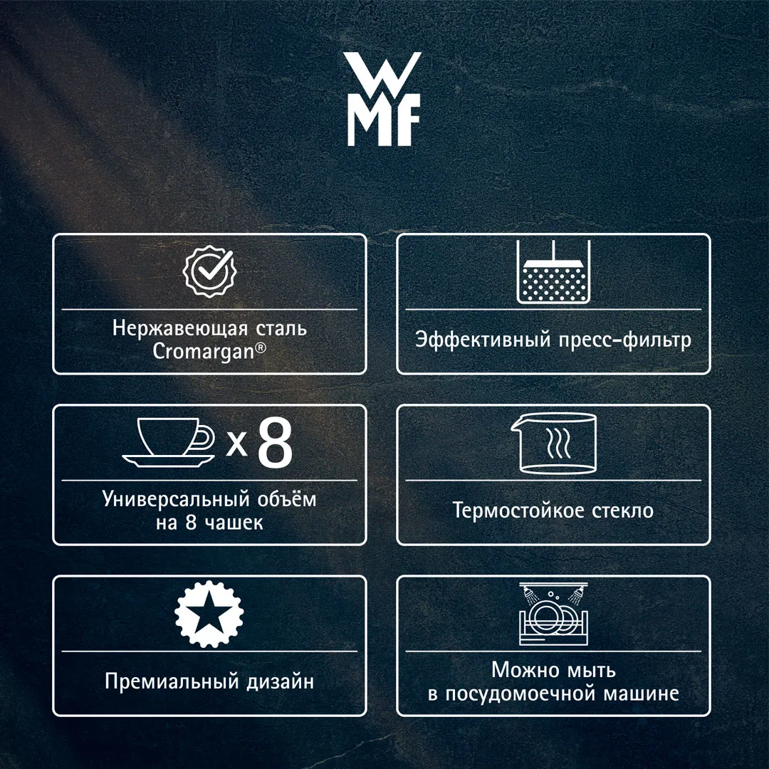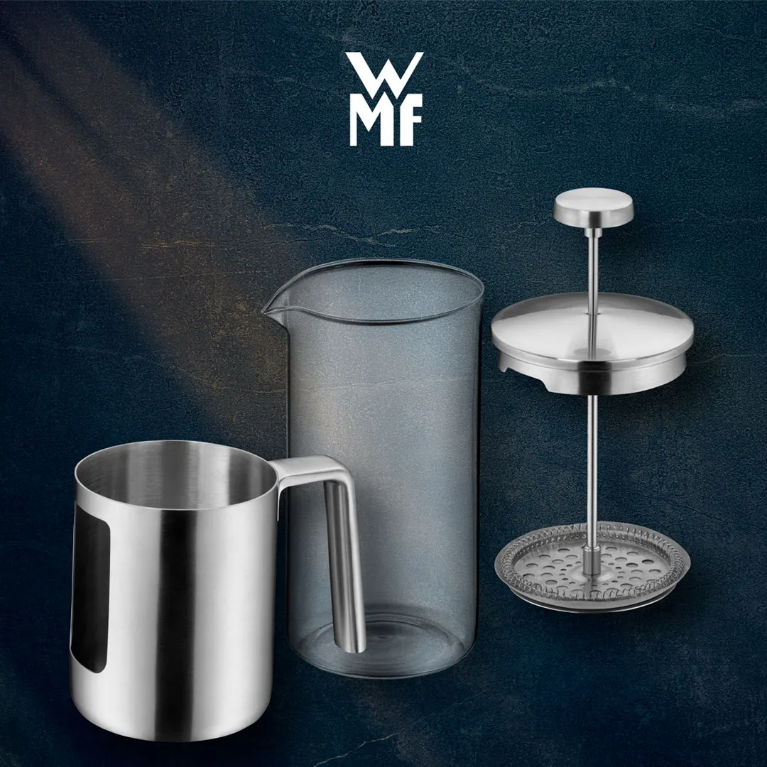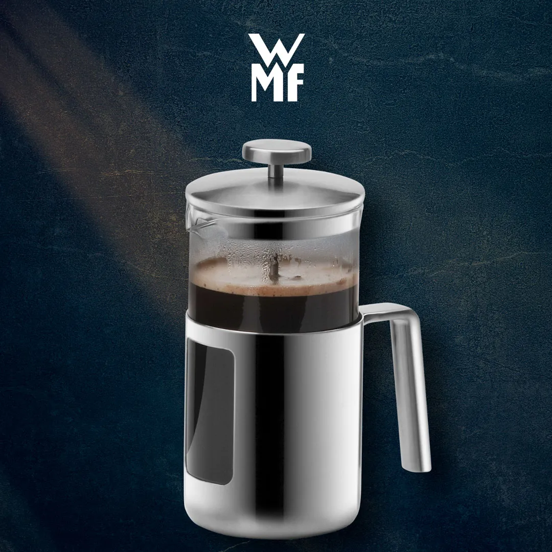 Приготовление кофе популярным и простым способом: добавьте в стеклянный кофейник френч-пресса WMF Kult по одной ложке кофе крупного помола на каждую чашку — максимально кофейник вмещает 8 чашек кофе, — затем залейте горячей, но не кипящей водой так, чтобы до верхнего края оставалось примерно 3 см. Размешайте кофе ложкой и оставьте насыщаться на 4 минуты. Медленно надавливайте на фильтр, опуская его вниз. Благодаря особой технологии фильтра WMF напиток раскрывает в кофейнике свой насыщенный цвет и аромат. Для дополнительной безопасности кофейник из термостойкого боросиликатного стекла имеет защитное обрамление из стали Cromargan®. За френч-прессом Kult очень легко ухаживать — все детали, кроме сита, можно мыть в посудомоечной машине.